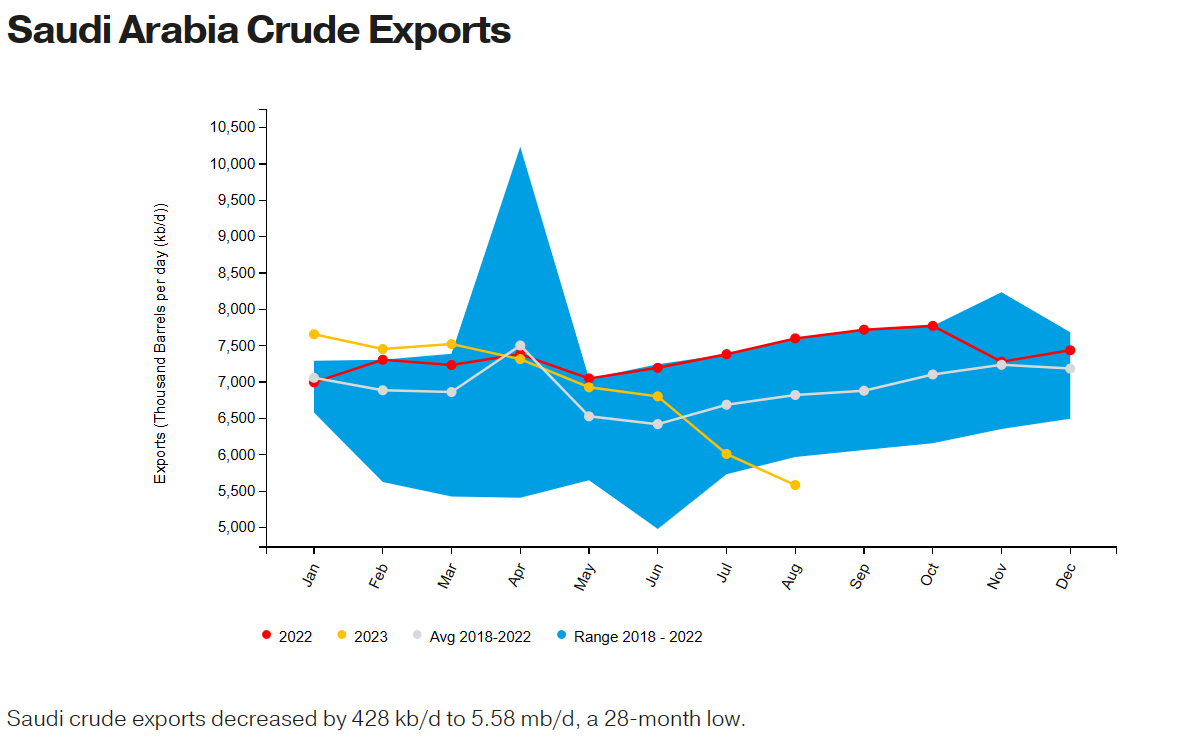 由于全球最大的原油出口国沙特阿拉伯继续减产以稳定市场,该国8月份原油出口降至28个月低点。