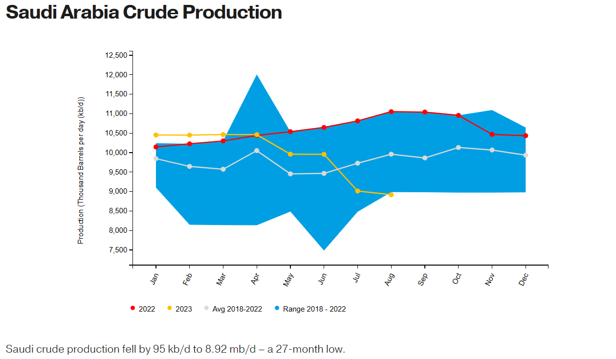 此外,沙特阿拉伯2023年8月的原油产量从7月份的901万桶/天下降至890万桶/天,已经是连续第五个月下降;并且比去年同期下降了19.3%。这一产量水平被认为是2021年6月以来的最低水平。