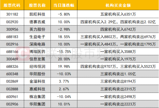 龙虎榜机构活跃度有所提升,买入方面,智能驾驶概念股德赛西威获机构买入2.29亿,同时遭机构卖出2.02亿;铜缆高速连接概念股凯旺科技获机构买入超6000万;消费电子概念股英力股份获机构买入超6000万;此外两只PCB概念股生益电子和深南电路均遭机构博弈。