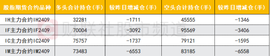 四大期指主力合约多空双方均大幅减仓,IH、IC合约多头减仓数量较多;IF合约空头减仓数量较多;IM合约多空双方减仓数量基本相当。