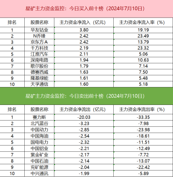 主力资金流出前十的个股所属板块较为杂乱,赛力斯净流出居首。