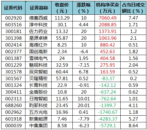 盘后龙虎榜数据显示,今日机构席位资金合计净卖出约1013.83万元。其中,净买入的个股9只,净卖出的个股8只。机构净买入最多的股票是德赛西威,净买入金额约7060.49万元;机构净买入居前的还有淳中科技、佐力药业、星源卓镁等股。机构净卖出最多的股票是中集集团,净卖出金额约5729.1万元;机构净卖出居前的还有新集能源、五方光电等股。
