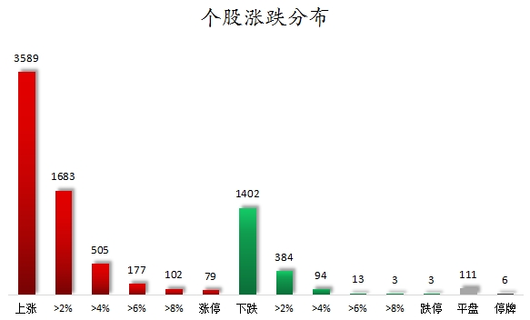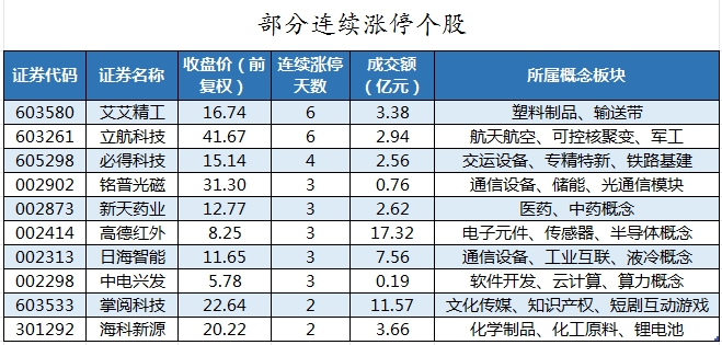 截至收盘,沪深两市合计3589只个股上涨,1402只个股下跌,平盘个股111只,停牌的个股6只。不含当日上市新股,共有79只个股涨停,3只个股跌停。连续涨停天数看,连续涨停天数超过2天的个股有19只。其中,立航科技、艾艾精工均已连收6个涨停板,连续涨停板数量最多。