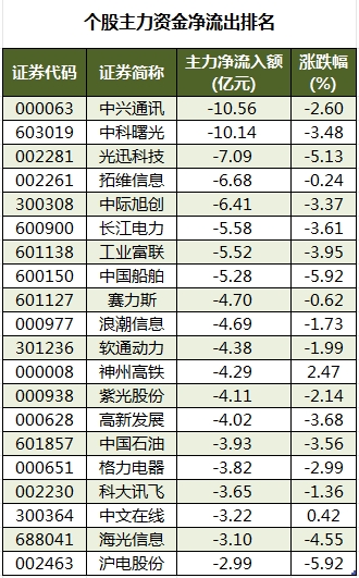 此外,2998只个股被主力资金净卖出,其中,86股被主力资金净卖出超1亿元。主力资金净流出最多的个股是中兴通讯,净流出金额为10.56亿元;主力资金净流出居前的个股还有中科曙光、光迅科技、拓维信息、中际旭创、长江电力,净流出金额分别为10.14亿元、7.09亿元、6.68亿元、6.41亿元、5.58亿元。