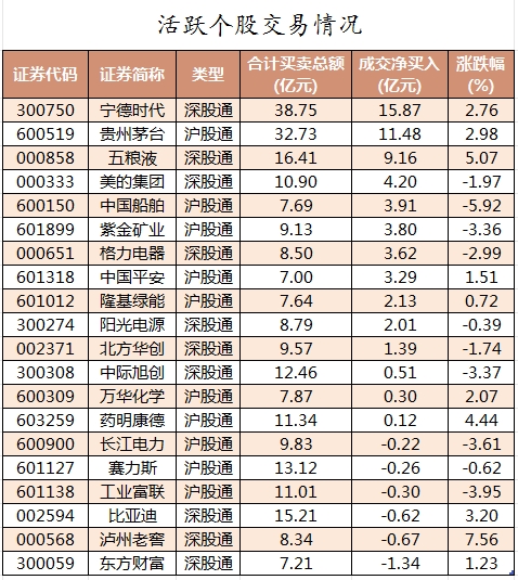 活跃个股方面,北向资金今日净买入较多的有宁德时代、贵州茅台、五粮液、美的集团、中国船舶,净买入金额分别为15.87亿元、11.48亿元、9.16亿元、4.2亿元、3.91亿元。北向资金净卖出较多的有东方财富、泸州老窖、比亚迪、工业富联、赛力斯,净卖出金额分别为1.34亿元、0.67亿元、0.62亿元、0.3亿元、0.26亿元。
