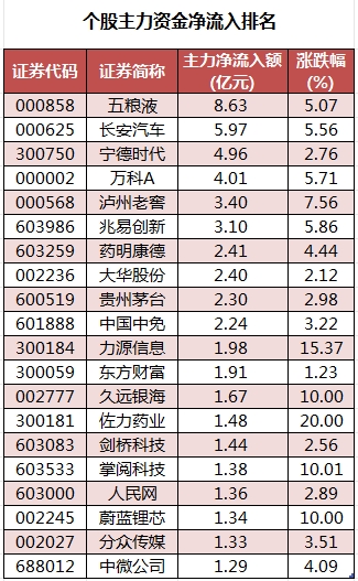 个股来看,今日有2102只个股获主力资金净流入,其中,31股获主力资金净流入超1亿元。五粮液主力资金净流入最多,净流入金额为8.63亿元;主力资金净流入居前的个股还有长安汽车、宁德时代、万科A、泸州老窖、兆易创新,流入金额分别为5.97亿元、4.96亿元、4.01亿元、3.4亿元、3.1亿元。