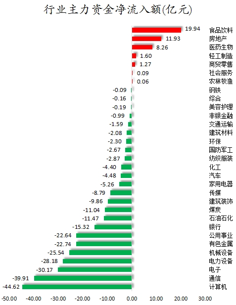 从行业板块来看,申万所属的31个一级行业,今日有7个行业板块主力资金呈现净流入,其中,食品饮料行业板块主力资金净流入最多,净流入金额为19.94亿元;行业板块主力资金净流入居前的还有房地产、医药生物,净流入金额分别为11.93亿元、8.26亿元。24个行业板块主力资金呈现净流出,其中,计算机行业板块主力资金净流出最多,净流出金额为44.62亿元;行业板块主力资金净流出靠前的还有通信、电子、电力设备、机械设备、有色金属,净流出金额分别为39.91亿元、30.17亿元、28.18亿元、25.54亿元、22.74亿元。