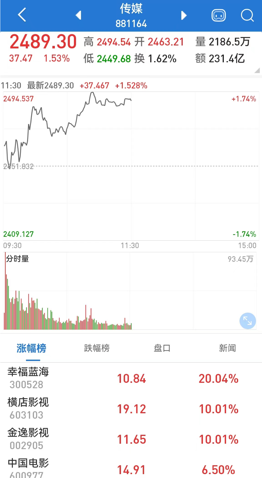 传媒娱乐股早间大幅冲高,板块指数放量直线拉升涨逾2%,半日成交接近前一交易日全天成交。幸福蓝海高开后快速20%涨停,横店影视、金逸影视亦强势涨停。港股市场,猫眼娱乐、阿里影业等也纷纷高开走强。