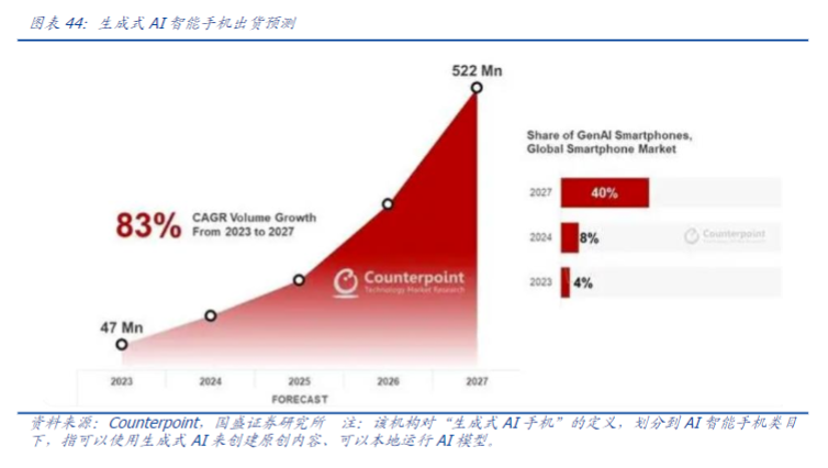 根据CounterpointResearch,预估2024年会成为生成式AI智能手机的关键元年,预估出货量将达到1亿台,在全球智能手机市场渗透率将达到8%,到2027年出货量将达到5.22亿台、复合年增长率为83%,在全球智能手机市场的渗透率达40%。