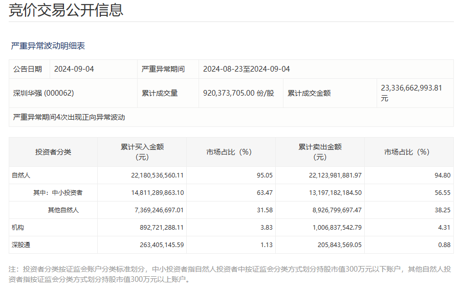 从资金面的情况来看,在深圳华强股价快速上涨期间,自然人投资者成为了买入该股的主力军。根据深交所9月4日披露的数据显示,深圳华强8月26日至9月4日累计上涨102.36%,涨幅严重异常期间获自然人买入217.63亿元,占比95.04%;其中,中小投资者累计买入147.04亿元,占比64.21%。机构投资者累计买入8.72亿元,占比3.81%。