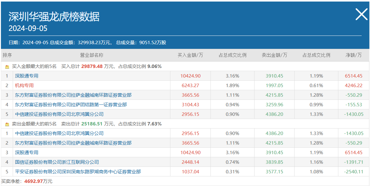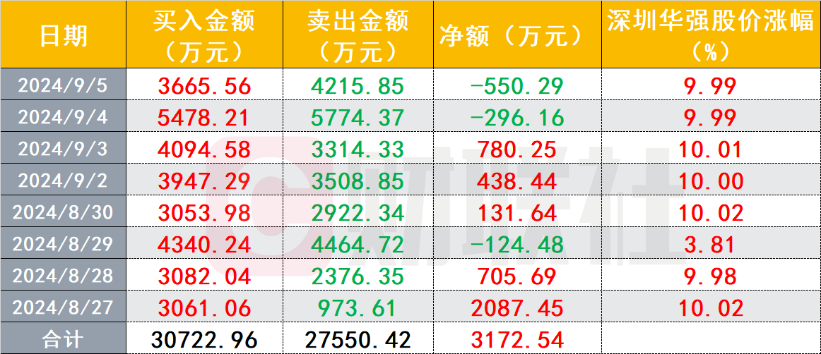 从统计情况来看,上述席位在8月27日至9月5日的8个交易日期间,累计净买入深圳华强超3000万元,其中,8月27日净买入该股最多,净买入金额超2000万元。从最近2个交易日来看,该席位已连续2天净卖出深圳华强,今日净卖出550万元。