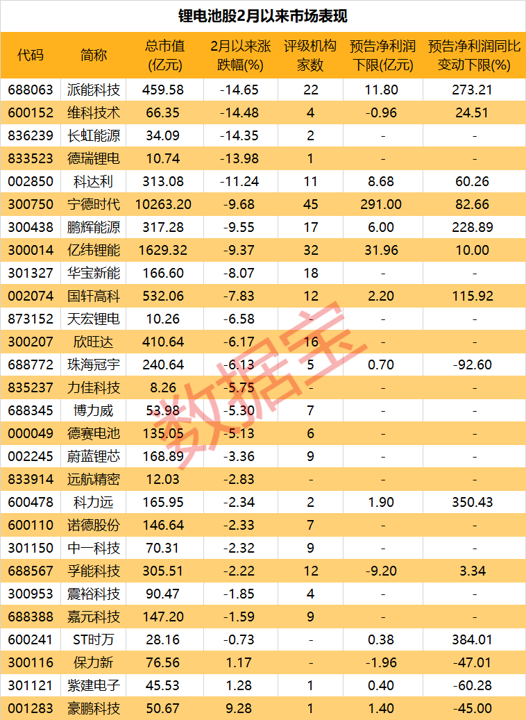 2月以来锂电池行业指数走低,申万锂电池指数累计下跌5.02%。行业半数以上个股跌逾5%,龙头宁德时代下跌9.68%,千亿巨头亿纬锂能下跌9.37%,科达利、德瑞锂电、长虹能源、维科技术、派能科技跌逾10%。