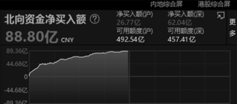 北向资金今天上午再度大举净买入,半日净买入额近89亿元。