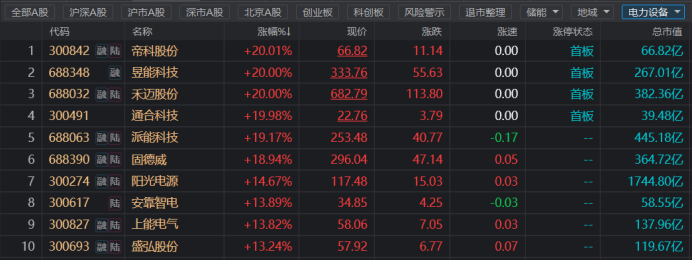 今日(4月26日),新能源赛道大幅回暖,其中,电力设备股表现最为活跃,截至收盘,帝科股份、昱能科技、禾迈股份、通合科技4股集体20cm涨停,神力股份、科力尔、爱旭股份等多股也封板涨停,此外,派能科技、固德威、阳光电源等多只行业白马涨幅也超10%。