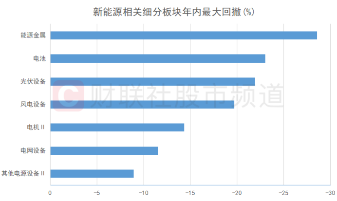 今年以来,市场热门题材频频涌现,但此前“炙手可热”的新能源相关板块则成为亏钱效应的“重灾区”,截至4月25日收盘数据,年内最大回撤居前的前五大板块(申万一级)分别为电力设备、汽车、基础化工、建筑材料及美容护理板块。若统计细分板块(申万二级),新能源相关板块中,能源金属、电池、光伏设备、风电设备、电机等细分板块跌幅居前。