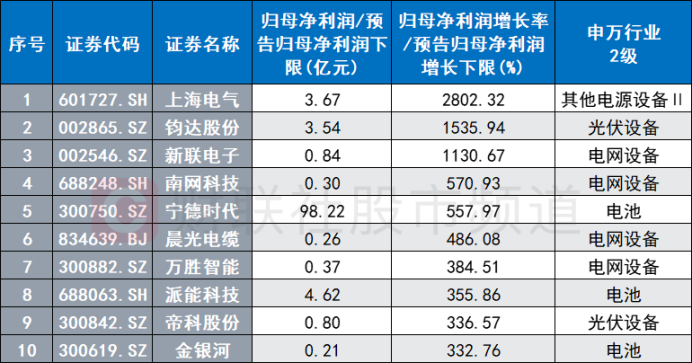 目前已发布业绩数据的电力设备股中,今年一季度归母净利润(或预告归母净利润下限)盈利且同比正增长的个股占比达七成,行业个股整体业绩增速中位数近38%,近40股的业绩增速实现翻倍增长,其中,12只个股获3倍以上增速。具体来看,上海电气、钧达股份、新联电子3股分别占据增速榜前三名,其业绩均同比增长超10倍。