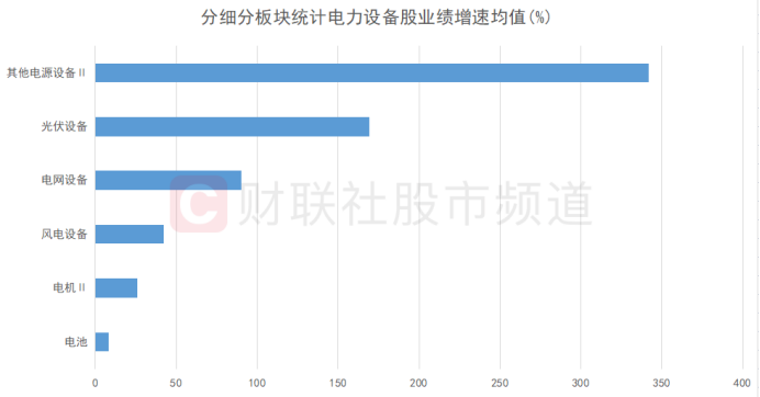 从细分行业(申万二级)来看,其他电源设备、光伏设备及电网设备板块业绩增速相对较高,而电池、电机等细分板块业绩增速则相对靠后。若分市值规模统计,超千亿元的各行业龙头股业绩增速均值达229%,其中,电池股宁德时代以5.58倍的增速表现最为亮眼,同为电池股的亿纬锂能增速近1.2倍,其余4只光伏设备股业绩平均增长近175%。