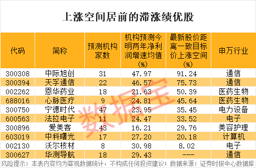 以最新收盘价与机构一致预测目标价相比,中际旭创、天孚通信、恩华药业、心脉医疗、宁德时代、法拉电子股价上涨空间超30%。