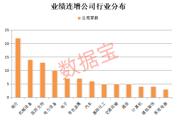 从行业分布来看,这些业绩连续增长的公司涉及25个行业,其中银行、机械设备、医药生物、电力设备均有10家及以上公司入围。