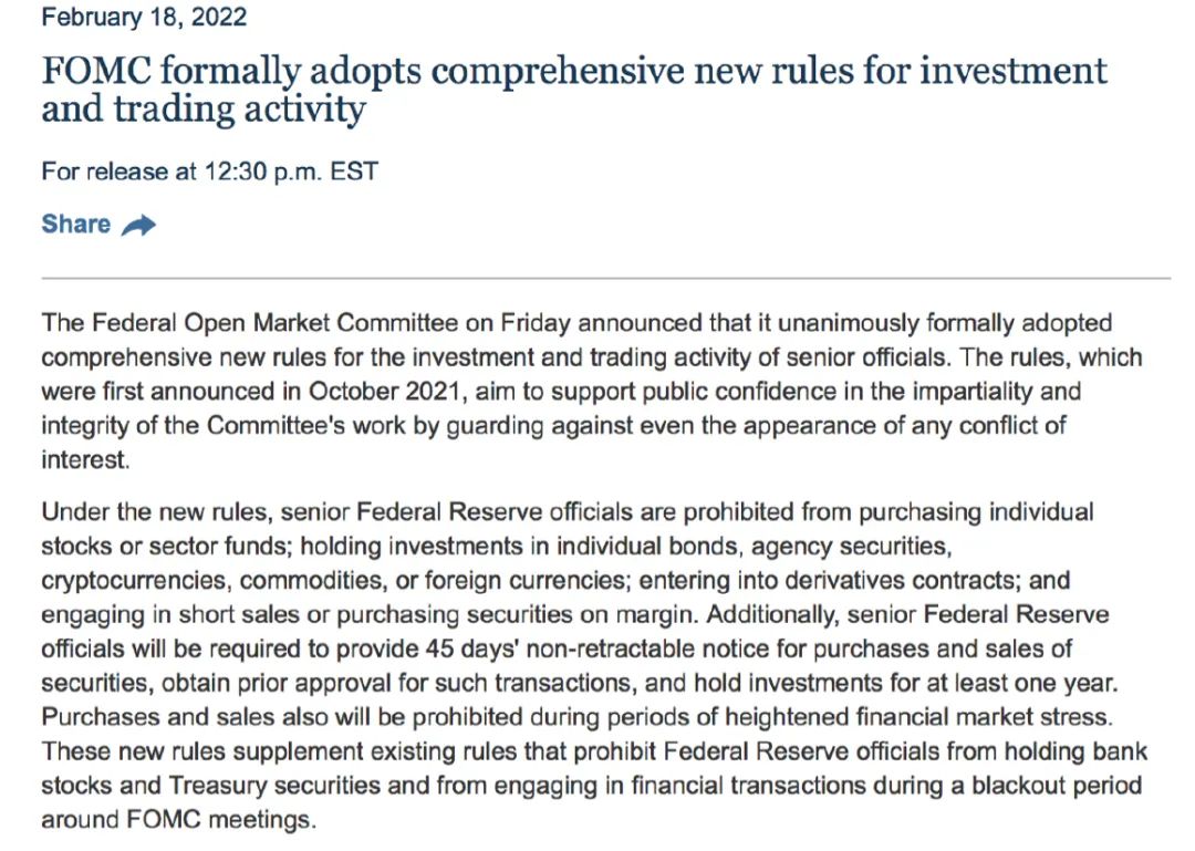 值得关注的信息还有美联储的动作:在数次陷入“炒股”风波,引发声誉危机后,日前,美联储制定的新交易规则正式获一致通过,严格限制其高级官员投资与交易活动。