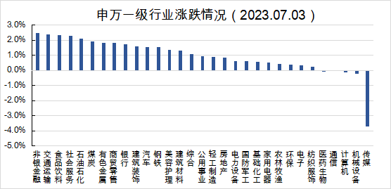 7月3日A股多数行业上涨,而在下跌的行业中仅有传媒行业大跌3.74%,其余行业跌幅均不到0.5%。从技术指标来看,有色金属、交通运输、商贸零售等行业的技术指标均大幅改善,底背离现象已经被证实,短期内或仍有上涨空间。