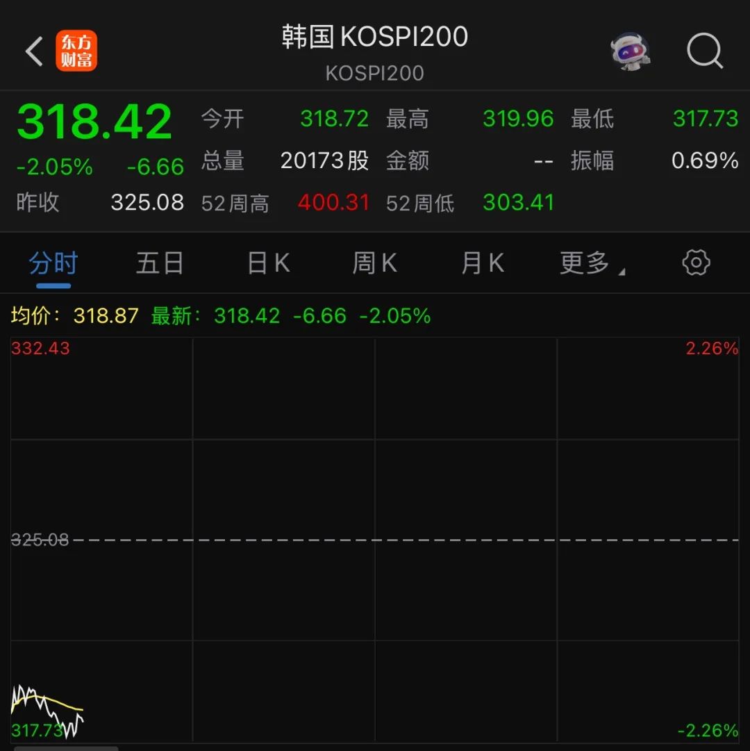 韩国股市也大幅下跌。韩国财政部长称,将加强对债券和外汇市场的监测。