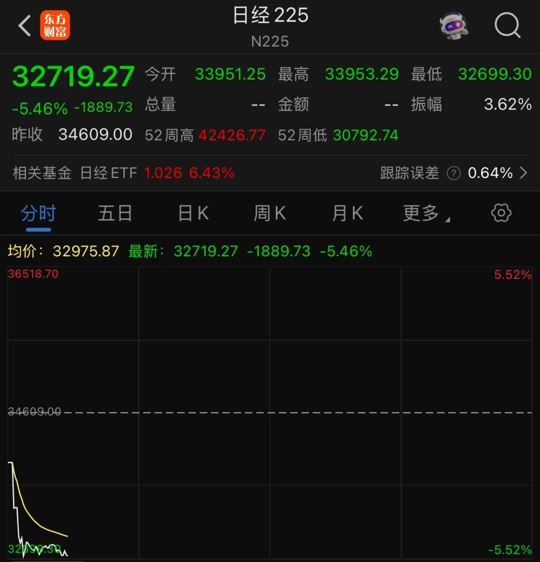美元崩了!日韩股市大跌 日经225指数跌超5%