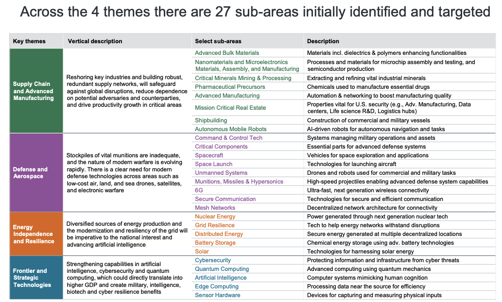 供应链与先进制造:功能性增强材料、微芯片封装与测试材料及工艺、关键工业矿物的提取与精炼、制药所需关键化学原料、先进制造(自动化、网络化)、数据中心/物流枢纽等关键产业地产、造船,以及由AI驱动的自动化移动机器人;