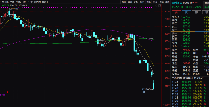 贵州茅台大幅下挫,盘中跌幅一度超过6%。