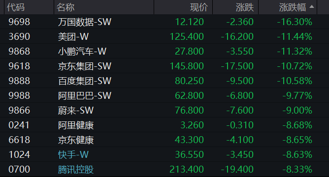 恒生科技指数成份股中,美团-W、京东集团-SW、百度集团-SW等多只互联网公司股票盘中跌幅超过10%。