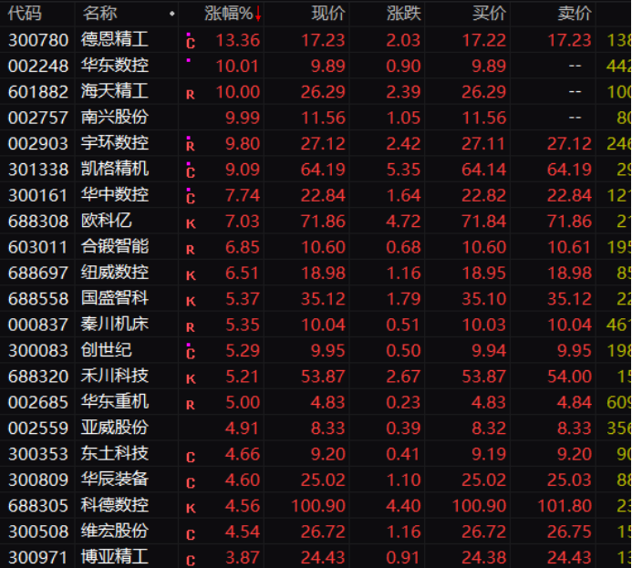 概念板块中,工业母机概念大涨。华东数控、海天精工、南兴股份等多股盘中触及涨停。