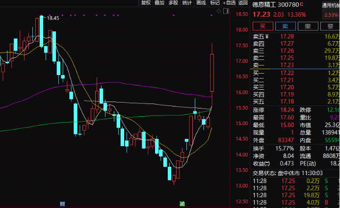受到上述消息影响,德恩精工今天上午大涨,盘中涨幅超过15%。