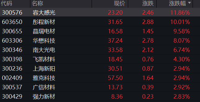 光刻胶概念大涨,Wind光刻胶指数大涨超5%,板块内个股全线飘红,容大感光涨超10%,彤程新材涨停。