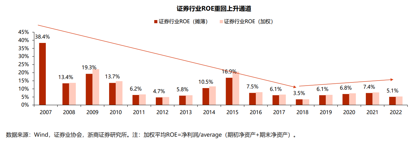 从历史ROE数据来看,梁凤洁表示,虽然随着费率下滑与重资本业务的发展,行业ROE波动下滑,但2018年证券行业盈利能力触及历史低点后,注册制改革、再融资松绑等行业利好政策频出,ROE重回上升通道。长期来看,行业ROE有望提升至9%,对应PB有约60%的提升空间。