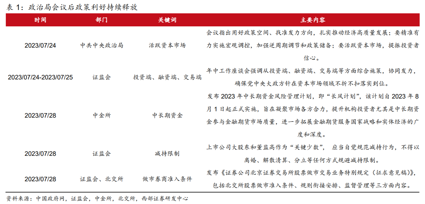此外,7月24日政治局会议首提“要活跃资本市场,提振投资者信心”;7月27日证监会召集头部券商开会,就活跃资本市场及提振投资者信心征求意见;7月28日中金所发布实施“长风计划”意在吸引中长期资金入市。申万宏源袁豪7月31日研报判断,后续资本市场投融资端改革相关政策预计将加速推出,券商板块催化将至。
