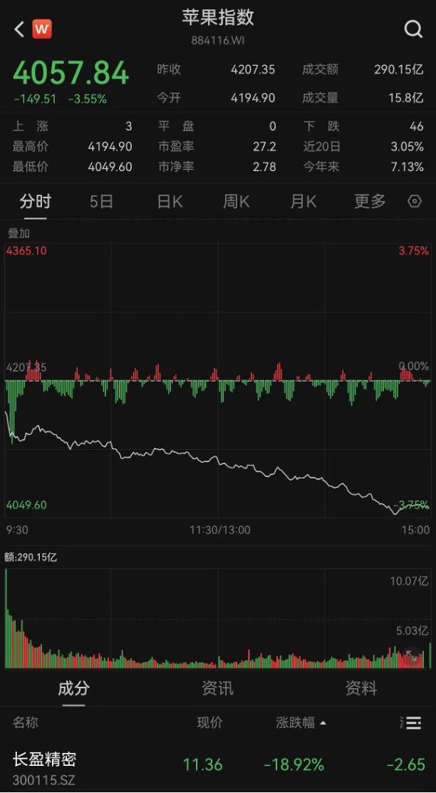 苹果股价收跌已经为A股果链的表现埋下了伏笔。6日开盘,上午开盘,果链企业的股价就开启下行,下午更是随着大盘跌破3200点继续探底,截至收盘,A股苹果指数下跌3.55%。成分股中,长盈精密跌幅最惨烈,下跌近19%。