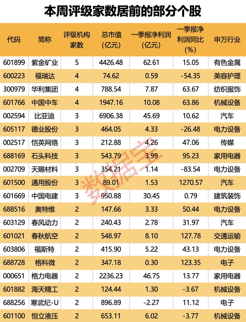 本周,机构关注度最高的是“矿茅”紫金矿业,共5家机构参与评级;其次,福瑞达、华利集团、中国中车均有4家机构评级。