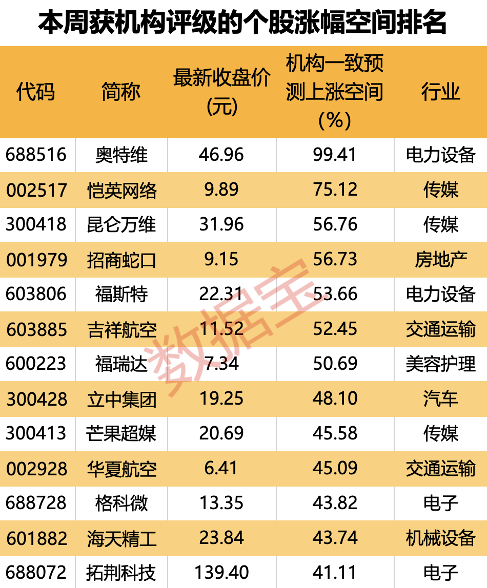 据数据宝统计,本周获2家及以上机构评级的个股中,13股最新收盘价较机构一致预测目标价上涨空间超40%,其中奥特维有望翻倍上涨。