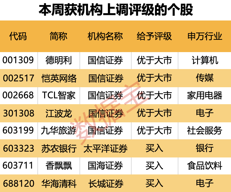 本周8股获得券商机构的看好,其中德明利、江波龙、华海清科3只半导体股分别获国信证券和长城证券上调评级。