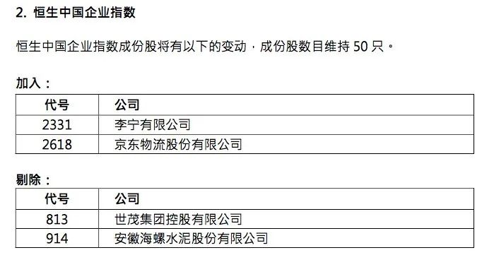 恒生中国企业指数加入李宁、京东物流,剔除世茂集团、海螺水泥。