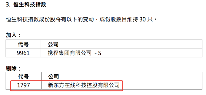 恒生科技指数则加入了携程,剔除了新东方在线。