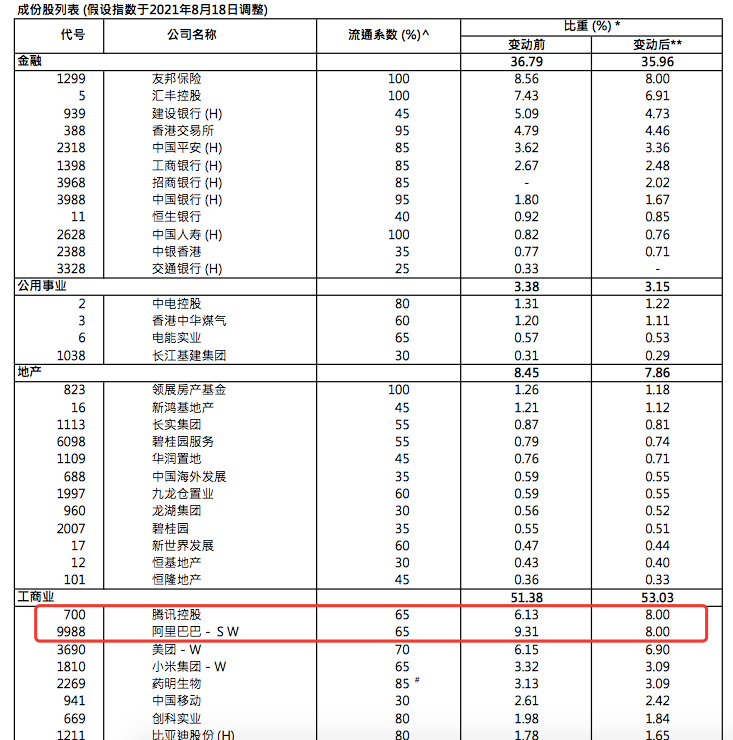 恒生指数大调整:腾讯权重升、阿里权重下降