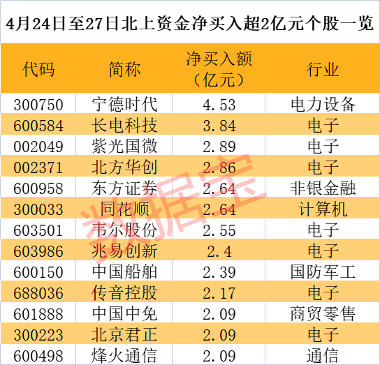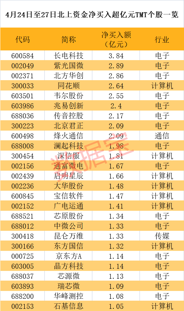 证券时报·数据宝统计,本周前4个交易日,北上资金加仓金额超过2亿元的个股共有14只,其中有9只个股来自TMT板块。它们分别是:长电科技(3.84亿元)、紫光国微(2.89亿元)、北方华创(2.86亿元)、同花顺(2.64亿元)、韦尔股份(2.55亿元)、兆易创新(2.40亿元)、传音控股(2.17亿元)、北京君正(2.09亿元)、烽火通信(2.09亿元),这9只个股增持金额合计超过23.5亿元。
