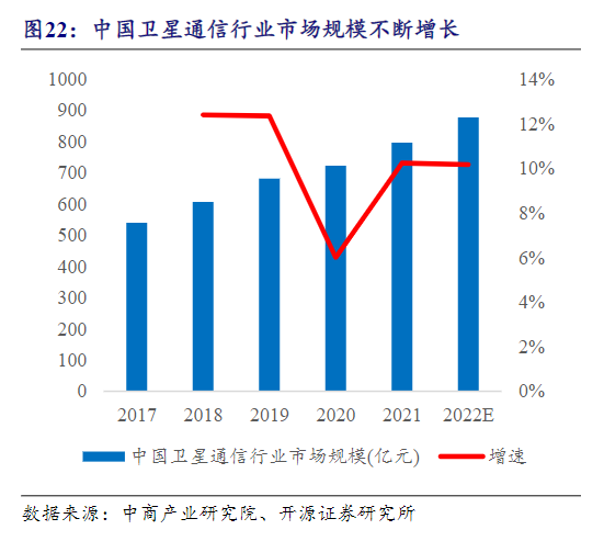 开源证券戴晶晶研报中表示,伴随低轨通信卫星系统应用领域不断成熟,预计未来中国通信卫星市场份额将继续增大。2017-2021年中国卫星通信行业市场规模不断扩大,2021年中国卫星通信行业市场规模为797亿元,增速为10.24%,根据中商产业研究院预测,2022年市场规模预计为878亿元,继续保持稳定增长。
