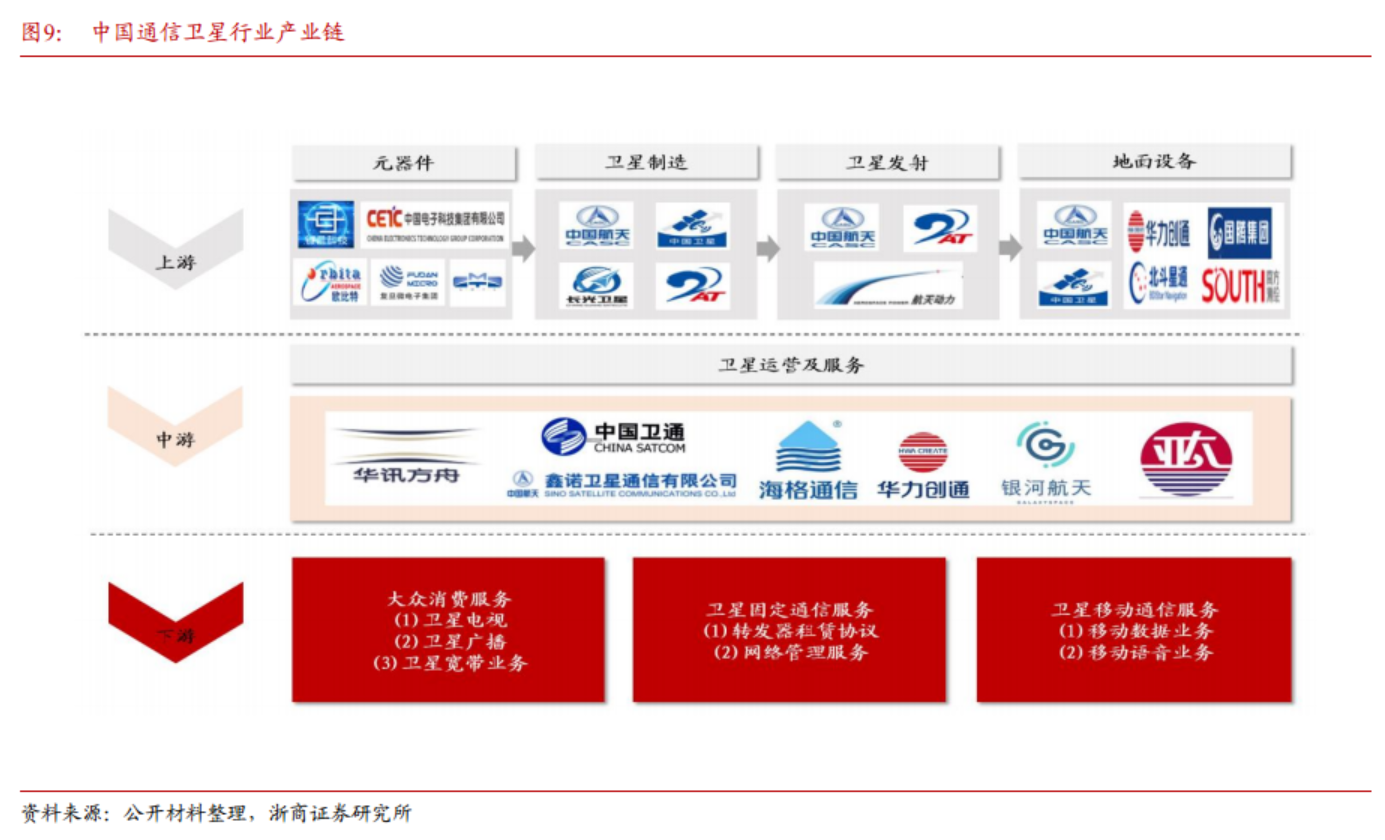 通信卫星产业链主要可分为三大环节:上游的卫星制造、卫星发射、地面设备;中游的卫星运营及服务;为下游业务提供技术和数据支持,涉及众多领域业务,主要包括大众消费通信服务、卫星固定通信服务和卫星移动通信服务等。