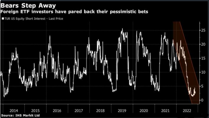 不仅土耳其国内投资者,随着国内投资者不断推高土耳其股市,海外投资者的看空情绪也有所缓解。在经历了此前数十亿美元的资金外流后,海外投资者目前持有创纪录的29%的土耳其股市份额。10月,土耳其最大的交易所交易基金(ETF)——iShares土耳其股市指数ETF(iSharesMSCITurkeyETF)的空头头寸也跌至1.4%,创下2014年1月以来的最低水平,今年3月时这一看空比例仍高达20%。