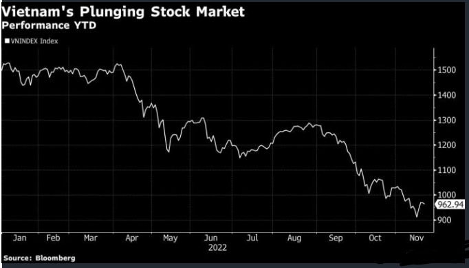 基准胡志明指数(VNIndex)今年截至11月22日的累计跌幅达到36%,与斯里兰卡并列成为全球表现最差的股市。其中,银行股和房地产股领跌。