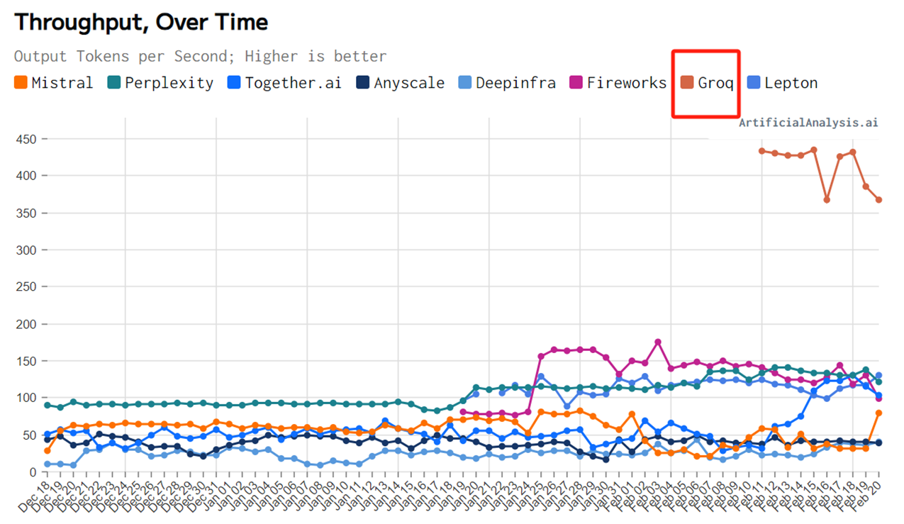 第三方机构artificialanalysis.ai给出的测评结果也显示,Groq的吞吐量速度称得上是“遥遥领先”。