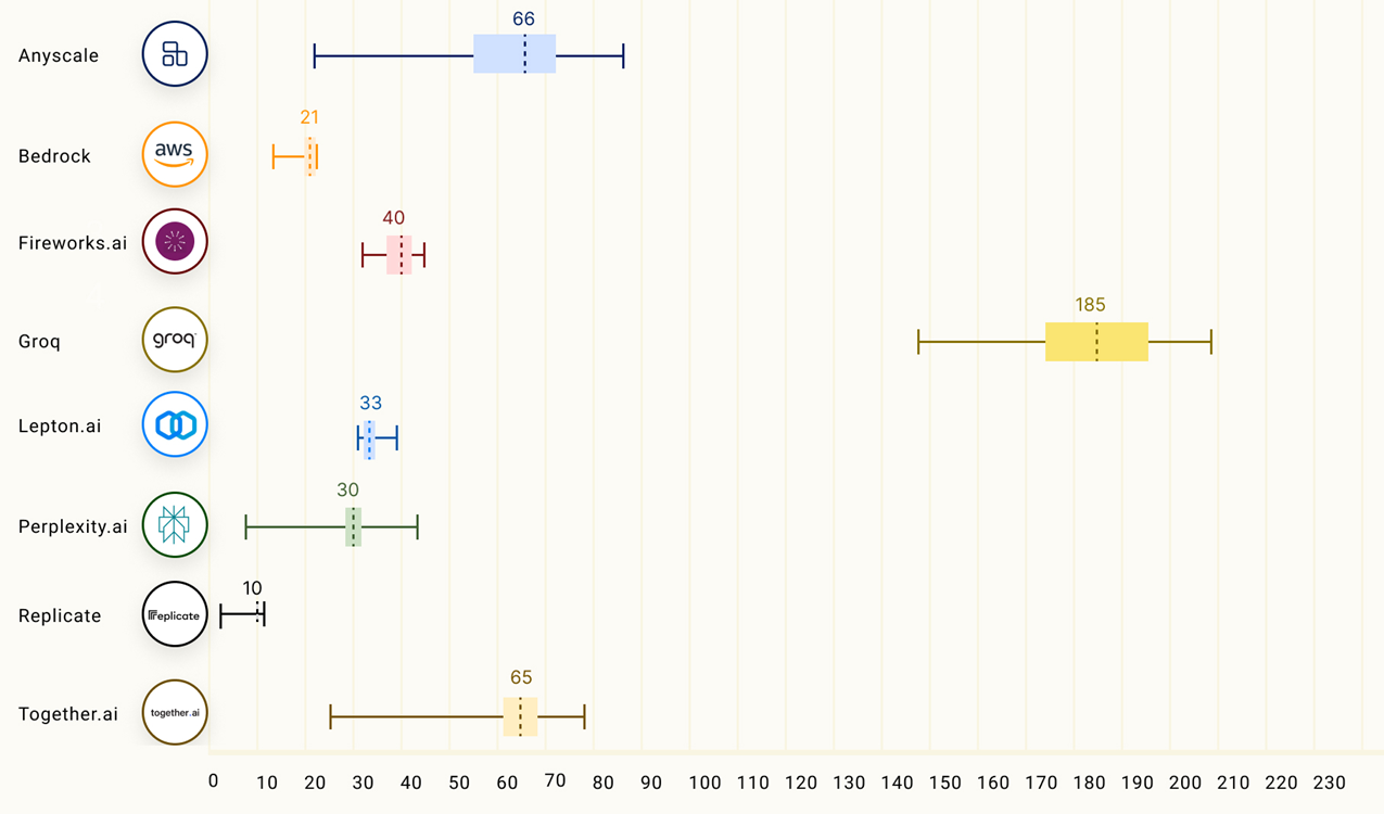 Groq也的确做到了“快”,根据Anyscale的LLMPerf排行显示,在GroqLPU推理引擎上运行的Llama270B,输出tokens吞吐量快了18倍,由于其他所有云推理供应商。