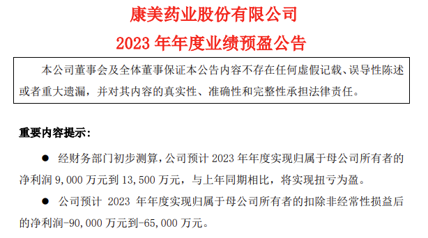 ST康美最新业绩预告显示,2023年,公司营收同比增长16%;扣非净利润为亏损6.5-9亿元,同比收窄40%-57%;归母净利润9000万元到1.35亿元,实现扭亏为盈。
